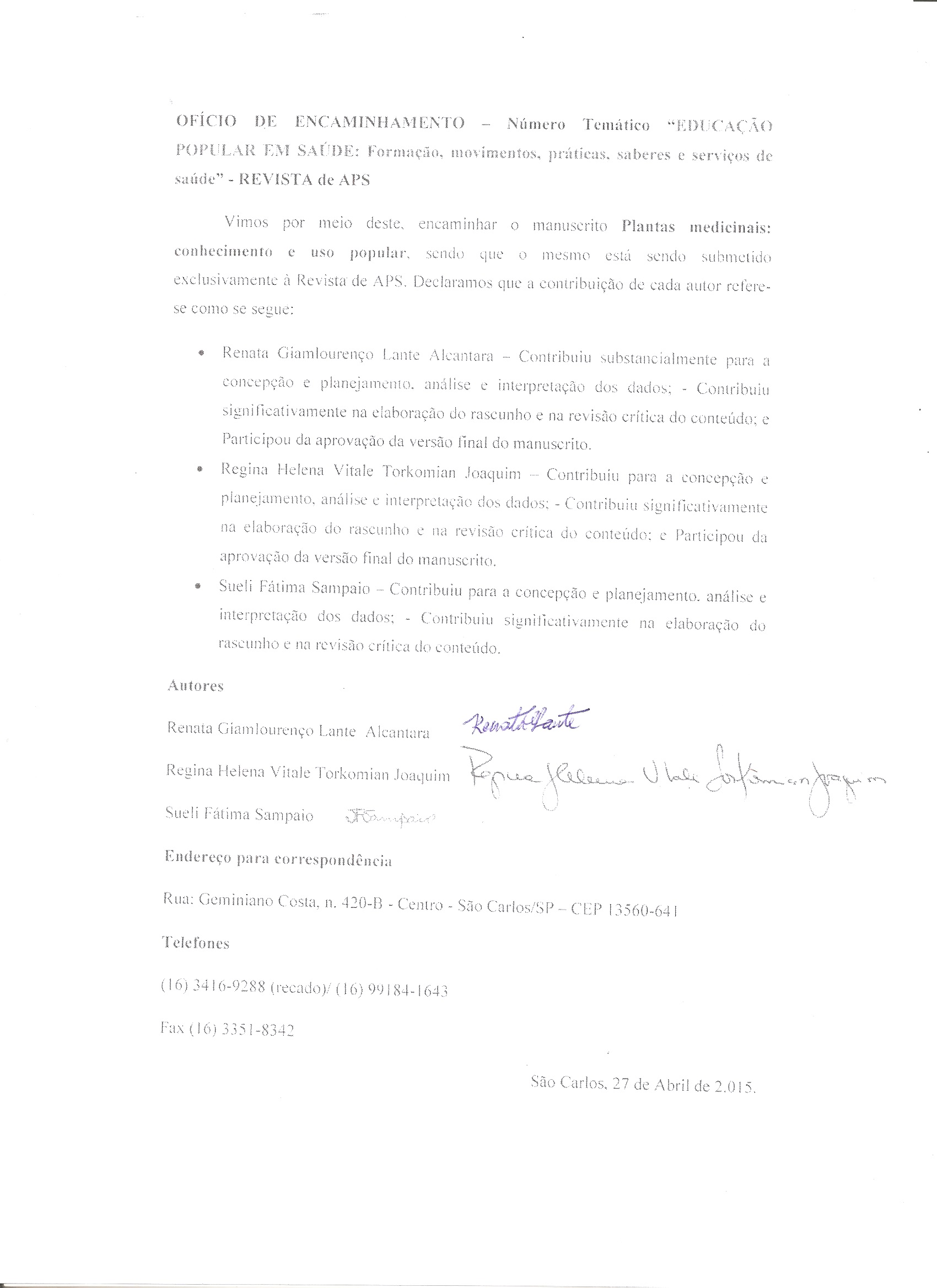 Os saberes populares e os conhecimentos científicos estão interligados por uma ponte acessível a todos os profissionais da saúde, nesse sentido essa pesquisa, teve como principal objetivo articular esses saberes e propagar o conceito de que o conhecimento é uma construção de mão dupla. Pesquisa populacional-territorial, descritiva e transversal, cujo objetivo geral foi descrever o conhecimento popular em relação às plantas medicinais junto a três Unidades de Saúde da Família (USF) no interior do Estado de São Paulo, no ano de 2013. Os objetivos específicos se detiveram em relacionar essas plantas medicinais quanto ao nome popular, partes usadas, modo de preparo, conservação, finalidade terapêutica, frequência e a origem do uso. A coleta de dados ocorreu por meio de entrevistas estruturadas, totalizando 25 participantes indicados pelas equipes das USFs. A caracterização dos participantes aponta que o maior número é do sexo feminino, 19 (76%) e 6 do sexo masculino (24%), com idade entre 32 e 80 anos. Os resultados revelam que o início desta prática, para a maioria dos participantes, aconteceu a partir de um aprendizado com os pais. Dentre as plantas apontadas, mais de 100 são para uso medicinal, caracterizando-se desde algumas frutas até resina e resíduos de madeira. As mais citadas foram o guaco, a hortelã, o boldo e o rubim. Em relação à finalidade de uso, a mais citada, o guaco é usado para afecções do trato respiratório (como tosse, expectoração, rinite, sinusite, estado gripal), fato em consonância com a literatura científica.Downloads