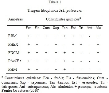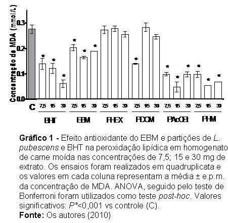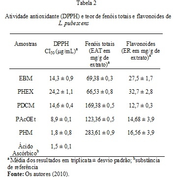 Este estudo teve como objetivos avaliar o potencial antioxidante e verificar o perfil fitoquímico do extrato bruto metanólico e das partições hexânica, diclorometânica, em acetato de etila e hidrometanólica das folhas de Lacistema pubescens. A atividade antioxidante foi avaliada pelos métodos do DPPH e TBA. Pelo método do DPPH, todas as amostras foram efetivas em sequestrar o radical livre e, pelo ensaio com TBA, todas as amostras, com exceção da partição hexânica, inibiram significativamente a peroxidação lipídica. A partição hidrometanólica foi a que apresentou a melhor atividade antioxidante e também o maior conteúdo de substâncias fenólicas. Estas, portanto, parecem ser as responsáveis pela atividade encontrada.