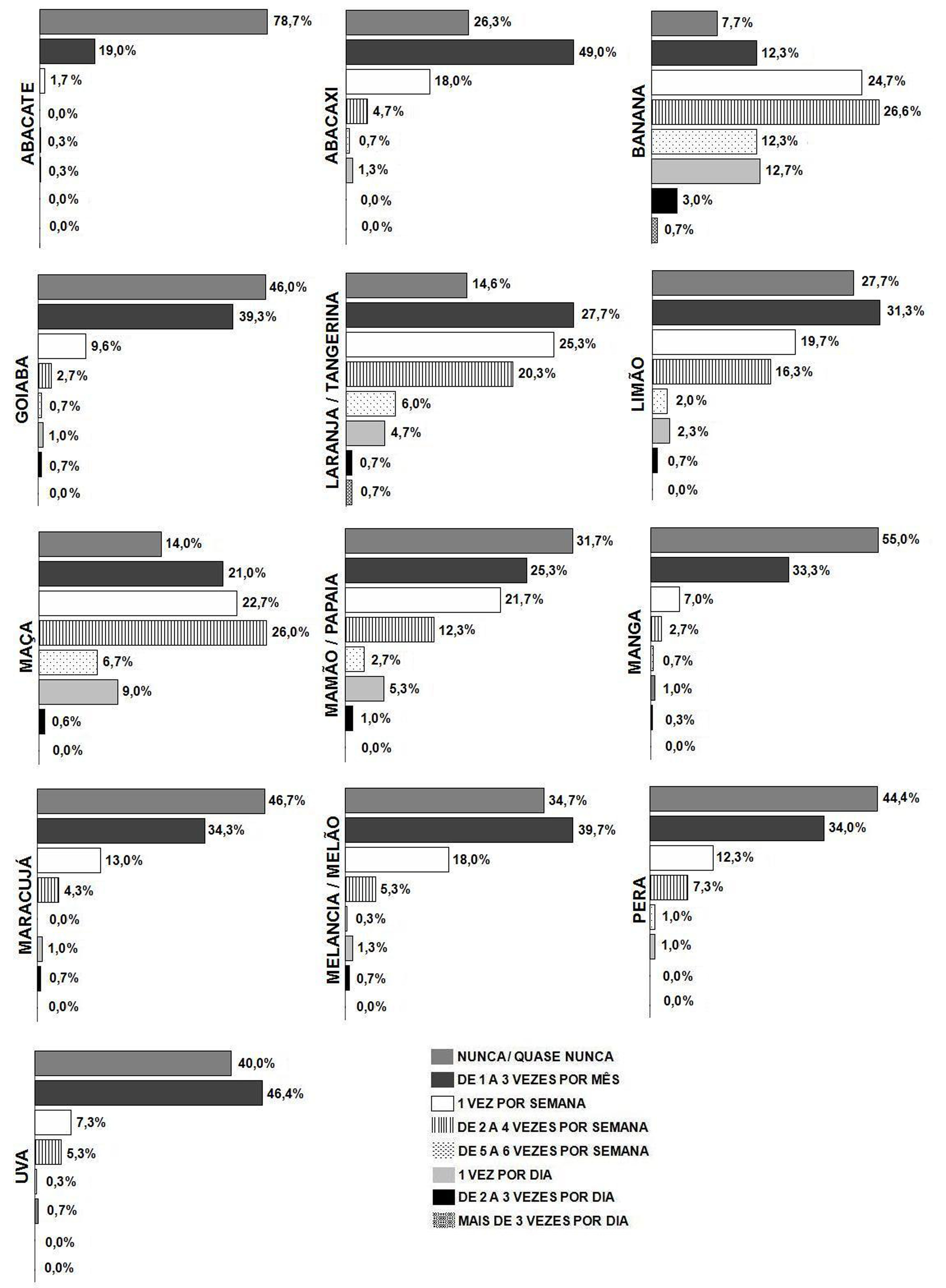 O objetivo deste estudo foi avaliar a frequência de ingestão de legumes, verduras e frutas por estudantes do curso de Farmácia da Universidade Federal de Juiz de Fora. A amostra foi composta por 300 universitários aos quais foram aplicados um questionário socioeconômico e um formulário contendo um questionário de frequência alimentar e questões relativas ao comportamento alimentar. Dos estudantes, 67,7% eram do sexo feminino, 98,3% solteiros, 53,0% residiam com a família e 50,3% apresentavam renda familiar superior a 5 salários mínimos. Além disso, 41,3% faziam de 3 a 4 refeições diariamente, 77,0% trocavam uma refeição principal por lanche pelo menos uma vez na semana, sendo a falta de tempo citada 54,3% das vezes como causa da omissão de refeições. Dos 15 legumes e verduras avaliados, alface e tomate destacaram-se pelas maiores frequências de consumo, seguidos pela cenoura, couve e beterraba. Entre as 13 frutas, o maior consumo foi de banana e laranja/tangerina, seguidas pela maçã e pelo mamão ou papaia. Um pequeno número de hortaliças e frutas é ingerido com maior frequência, o que contraria as recomendações nutricionais, que estimulam variabilidade no consumo. A frequência de ingestão dificilmente atingiria ao recomendado, o que sugere uma inadequação não só qualitativa, mas também quantitativa em relação à alimentação dos estudantes. Tornam-se cabíveis medidas de estímulo ao consumo destes grupos de alimentos por essa população, na tentativa de aliar os conhecimentos teóricos adquiridos na faculdade à prática alimentar.
