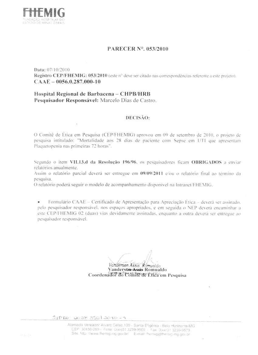 É provável que a trombocitopenia se relacione a uma maior severidade e progressão da sepse e a sua correção parece estar associada a melhor prognóstico. O objetivo deste estudo foi avaliar a presença de trombocitopenia nas primeiras 72 horas do diagnóstico de sepse como fator prognóstico (mortalidade aos 28 dias) em pacientes internados em Unidade de Terapia Intensiva geral do Hospital Regional de Barbacena, vinculado à Fundação Hospitalar do Estado de Minas Gerais (HRB-FHEMIG), durante o período de 2008 a 2011. Trata-se de um estudo de corte transversal em que os dados foram obtidos do banco de prontuários do HRB-FHEMIG. As variáveis deste banco incluíram níveis de plaquetas nas primeiras 72 horas do diagnóstico de sepse, data de admissão, data de início da sepse, idade, sexo, origem do paciente, APACHE II (Acute Physiology and Chronic Health Evaluation II), lactato arterial, cor da pele, foco primário, resposta a vasopressores e evolução aos 28 dias.