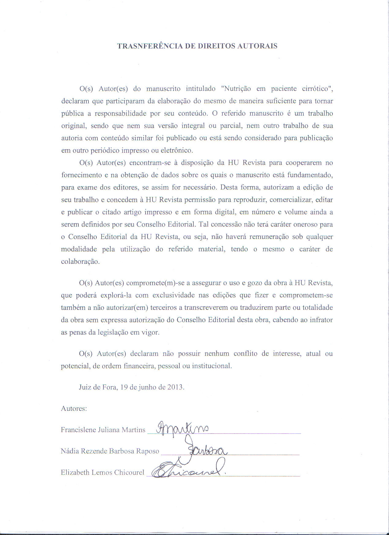 O fígado pode ser acometido por diversas patologias tanto agudas, quanto crônicas, dentre elas, a cirrose se destaca por sua elevada incidência. No Brasil, essa doença foi responsável por mais de 298.000 internações hospitalares entre 2001 e 2010 e mais de 128.000 óbitos entre 2001 e 2009. A cirrose hepática é caracterizada pela alteração estrutural e funcional do fígado, através da qual ocorre substituição da estrutura hepática normal por nódulos circundados por fibrose. Dentre as diversas implicações clínicas manifestadas pelo paciente podem-se citar: fibrose, ascite, hipertensão portal, encefalopatia hepática e anastomoses. Como resultante das alterações hepáticas, sobretudo em pacientes que consomem álcool, nota-se que o cirrótico também desenvolve desnutrição proteico-energética (DPE). A origem da má nutrição é multifatorial, sendo que a mesma provém da diminuição do consumo de nutrientes, bem como da alteração na digestão, absorção e metabolismo dos mesmos. Os especialistas têm a DPE como um importante fator para determinar o prognóstico do paciente com cirrose. Muitos são os métodos utilizados para a avaliação do estado nutricional do paciente cirrótico, no entanto, os parâmetros geralmente empregados na prática clínica têm seu uso limitado em pacientes cirróticos. A reversão do quadro nutricional do paciente é possível e, para tal, a suplementação nutricional deve ser determinada de acordo com as necessidades dos mesmos. A intervenção nutricional é sempre benéfica aos pacientes, proporcionando benefícios em curto e longo prazo.