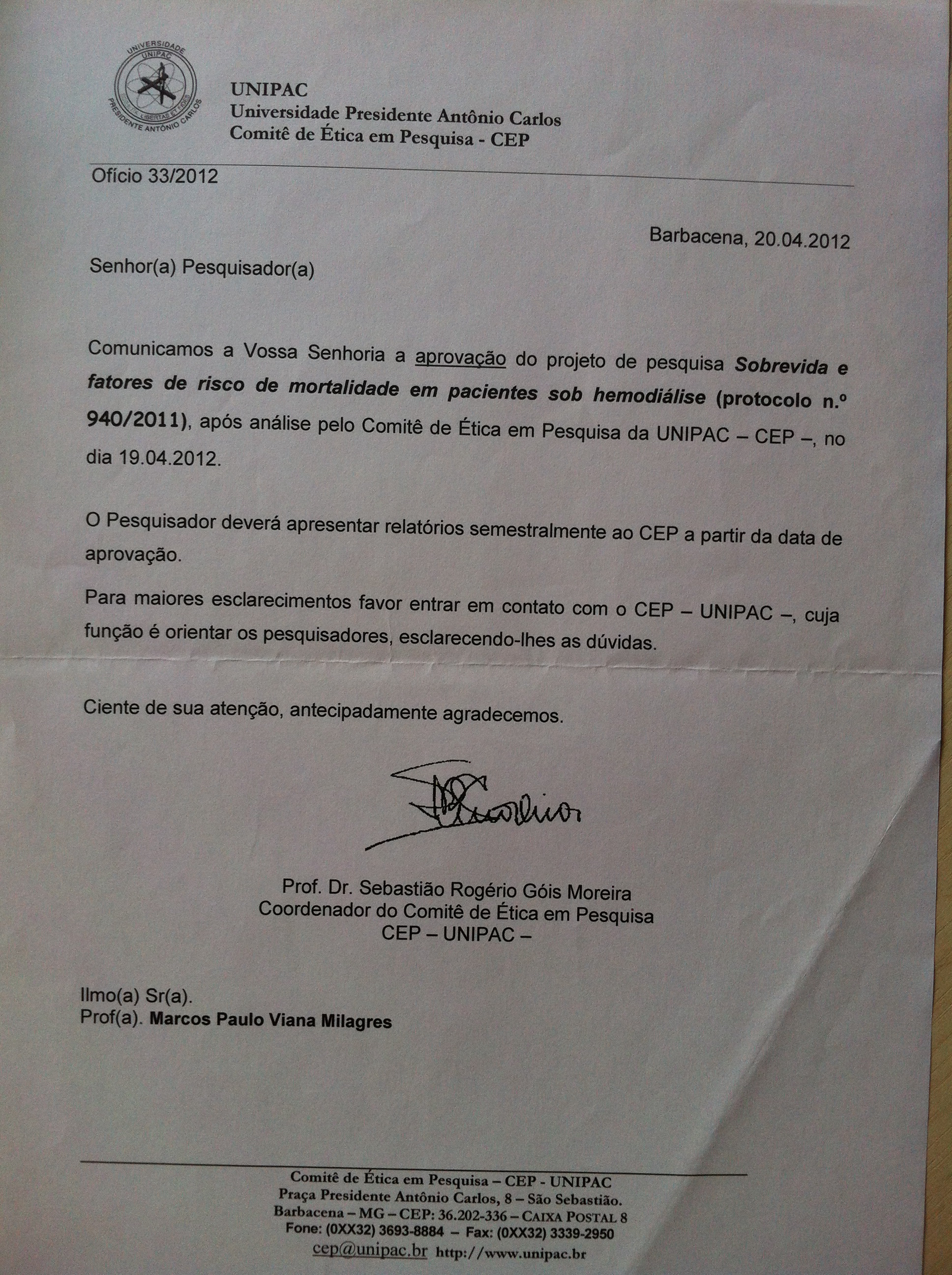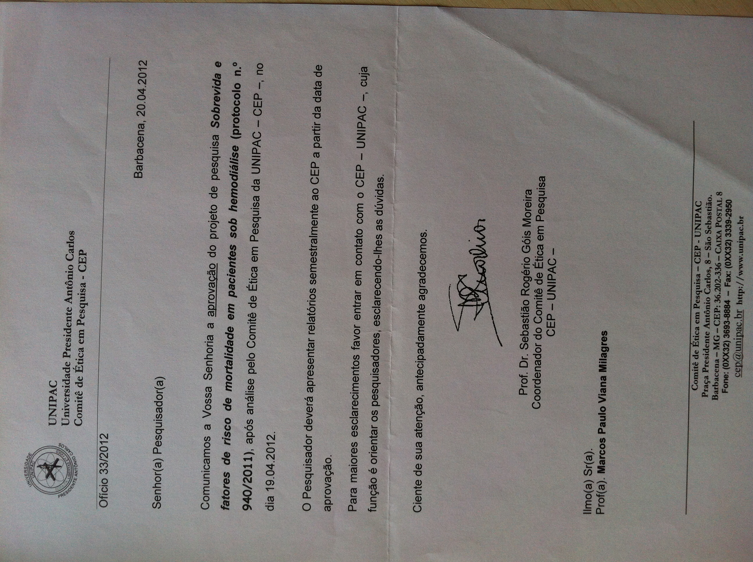 SILVA, L. A. B.; MEZZONO, F. N.; PANSARD, H. M.; ARANTES, L. C.; REMPBEL, W.; ARGENTA, L. C. et al. Sobrevida em hemodiálise crônica: estudo de coorte de1009 pacientes em 25 anos. Jornal Brasileiro de Nefrologia, São Paulo, v.31, n.3, 2009.