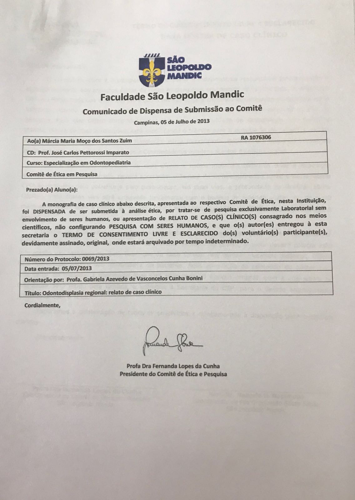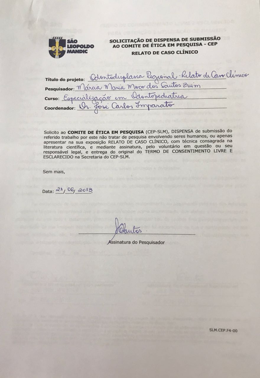 CARREIRA, A.S.D.; BASTOS, R.T.R.M.; KATAOKA, M.S.; PINHEIRO, M.G.R.; PINHEIRO, L.R.; PINHEIRO, J.J.V. Regional odontodysplasia: case report in maxila crossing the midline. Revista Gaúcha de Odontologia, Porto Alegre, RS, v. 59, n.1, jan./mar. 2011.