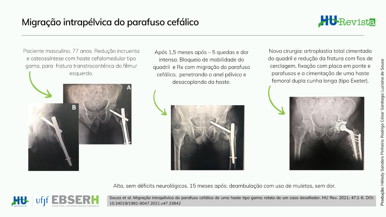 Introdução: A migração intrapélvica do parafuso cefálico de hastes cefalomedulares é uma complicação rara das fraturas transtrocantéricas e está associada a alta morbi-mortalidade. Objetivo: Relatar um novo caso de migração intrapélvica do parafuso cefálico com intuito de buscar soluções para essa complicação. Relato de Caso: Apresentamos um caso de migração intrapélvica do parafuso cefálico ocorrido no pós-operatório de seis semanas de um paciente de 77 anos com fratura transtrocantérica tratado com haste cefalomedular (tipo gama) e relatos de múltiplas quedas após a cirurgia inicial, discutimos os aspectos relacionados as possíveis causas desta complicação, ao planejamento e execução do tratamento, bem como ao prognostico desta lesão desafiadora. Conclusão: Percebemos que ainda é preciso ampliar o debate em busca da elucidação completa da gênese dessa complicação, uma vez que esta ainda permanece obscura.