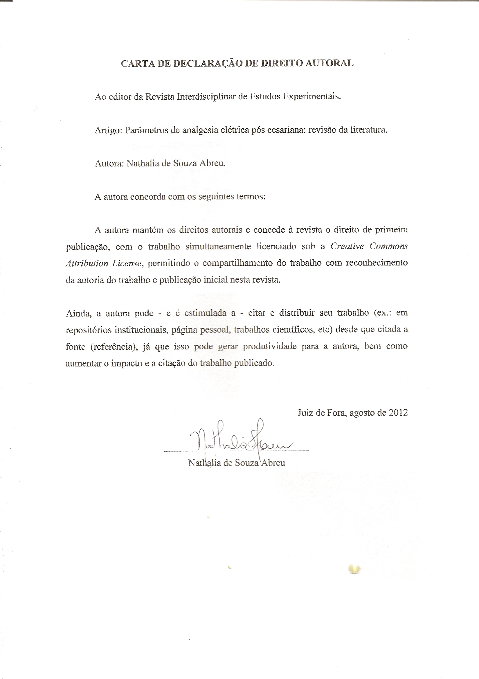 - Autores têm permissão e são estimulados a citar e distribuir seu trabalho (ex.: em repositórios institucionais, página pessoal, trabalhos científicos, etc) desde que citada a fonte (referência), já que isso pode gerar produtividade para os autores, bem como aumentar o impacto e a citação do trabalho publicado.